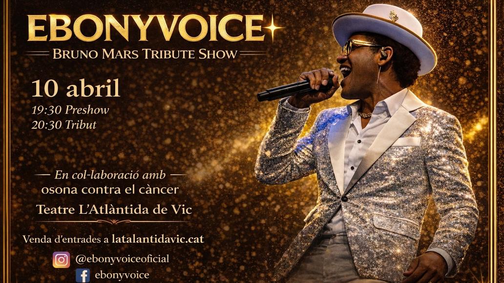 Després d’una carrera de més de 25 anys sobre els escenaris, col·laboracions amb artistes de talla internacional i una pre-nominació als Latin Grammy, EbonyVoice presenta el seu espectacle més ambiciós fins ara: EBONYVOICE – BRUNO MARS TRIBUTE SHOW. Un xou que ret homenatge a una de les figures més potents i carismàtiques del pop, el funk i el soul del segle XXI.Amb una posada en escena vibrant, una banda en directe de músics excepcionals i una interpretació vocal que captura tota l’energia, el groove i l’essència del mateix Bruno Mars, EbonyVoice et transportarà a una experiència trepidant i absolutament immersiva. Un autèntic viatge per l’univers Mars: des dels seus primers hits fins als èxits mundials que han marcat una generació.